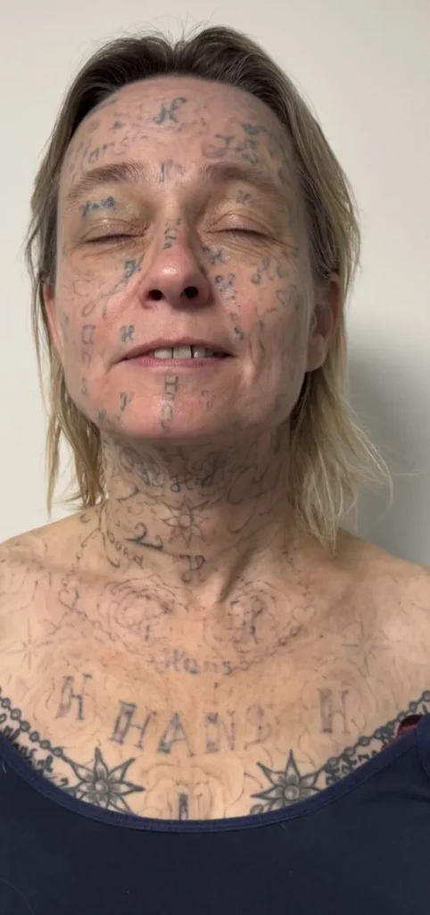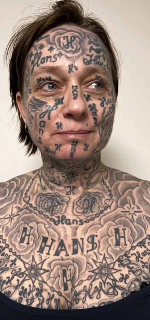 The woman, identified only as Joke, said the tattoos were done over several years using a cheap tattoo machine her former partner purchased online. According to reports, nearly 90% of her body was eventually covered in ink, much of it featuring his name, initials, and phrases suggesting she was his “property.”